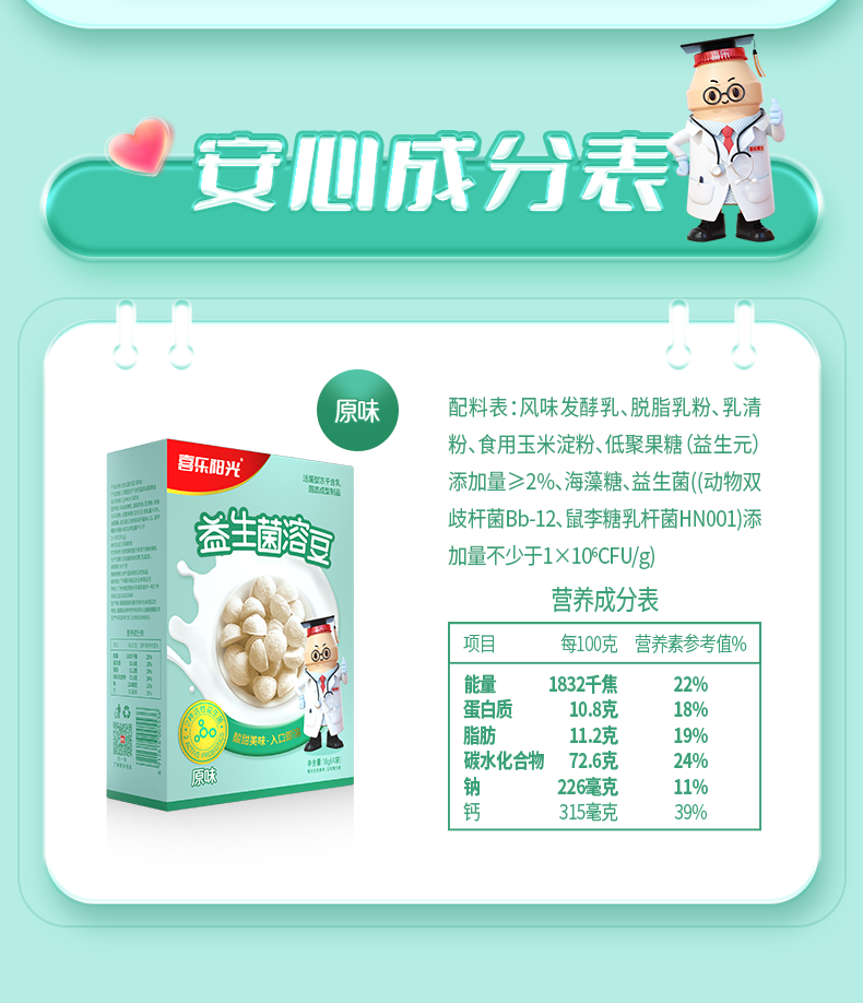 添加益生菌、益生元:活性益生菌含量1*10^6