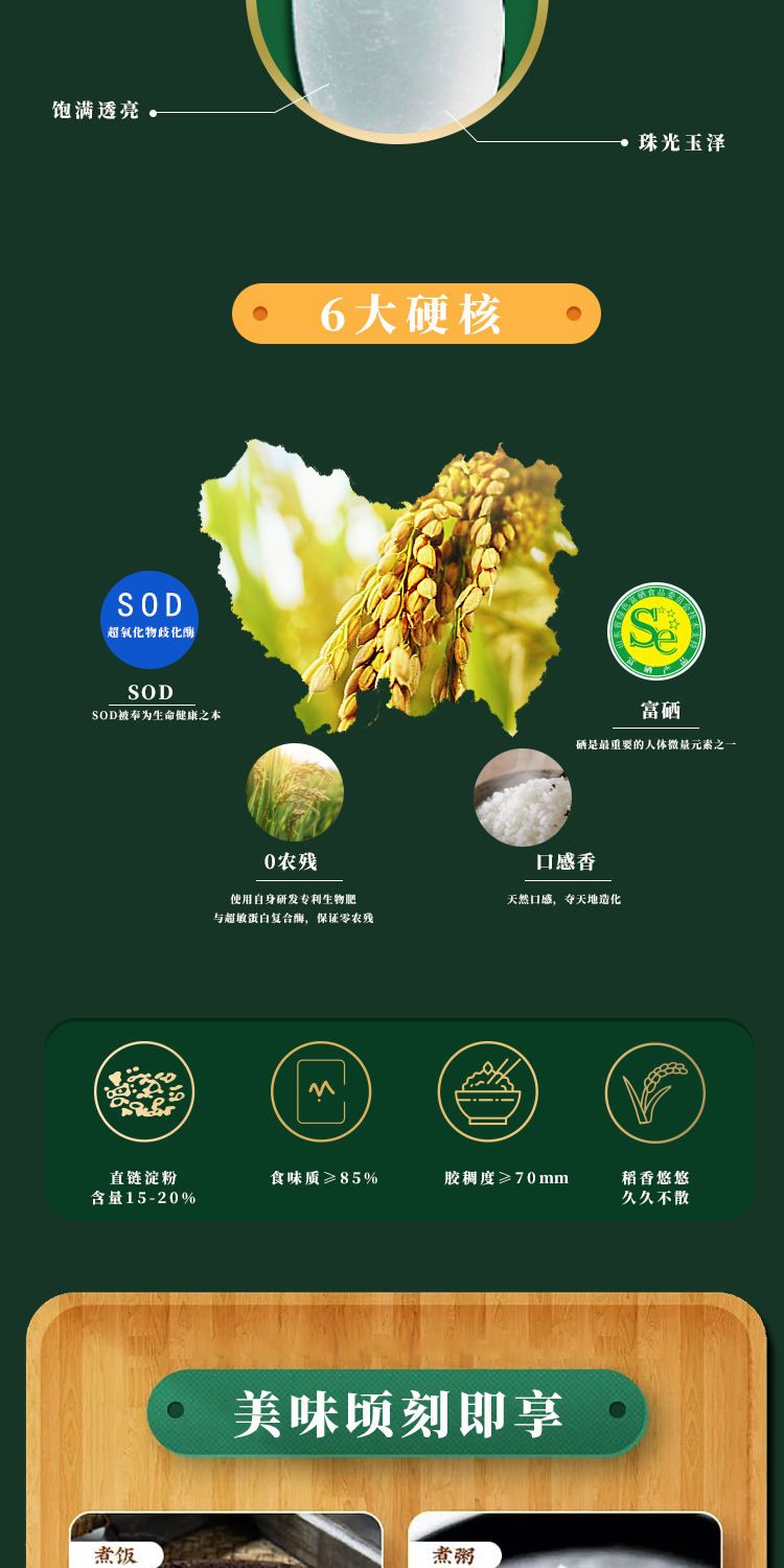 晶瑩如珠,飽滿纖長;韻味優(yōu):谷物香甜,軟糯Q彈,唇齒留香