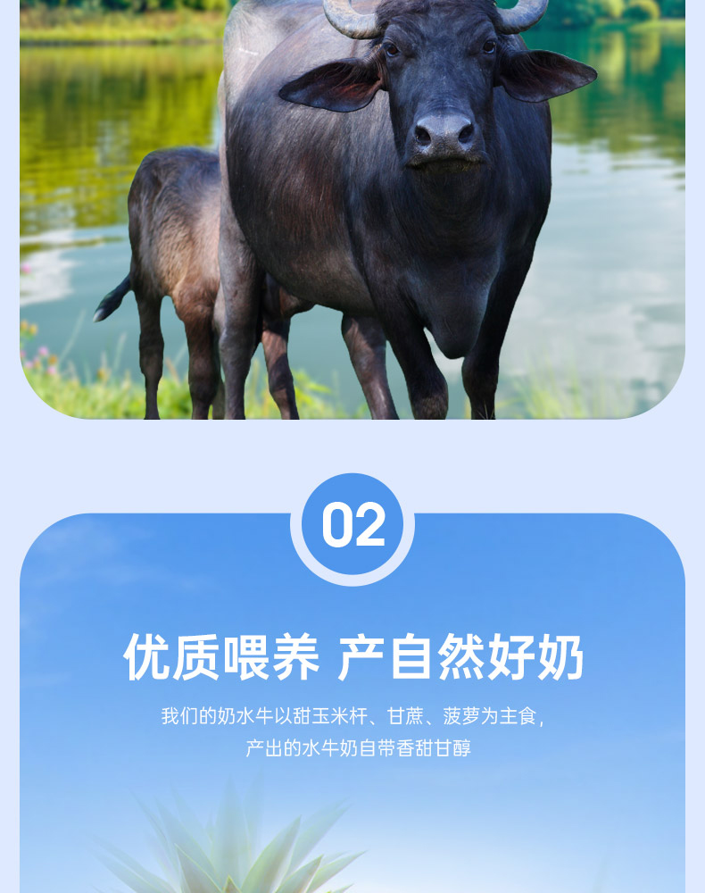 優質喂養,產自然好奶:我們的奶水牛以甜玉米桿、甘蔗、菠蘿為主食,產出的水牛奶自帶香甜甘醇。
