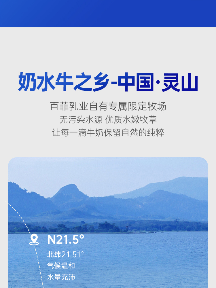 奶水牛之鄉-中國·靈山:百菲乳業自有專屬限定牧場,無污染水源,優質水嫩牧草,讓每一滴牛奶保留自然的純粹。