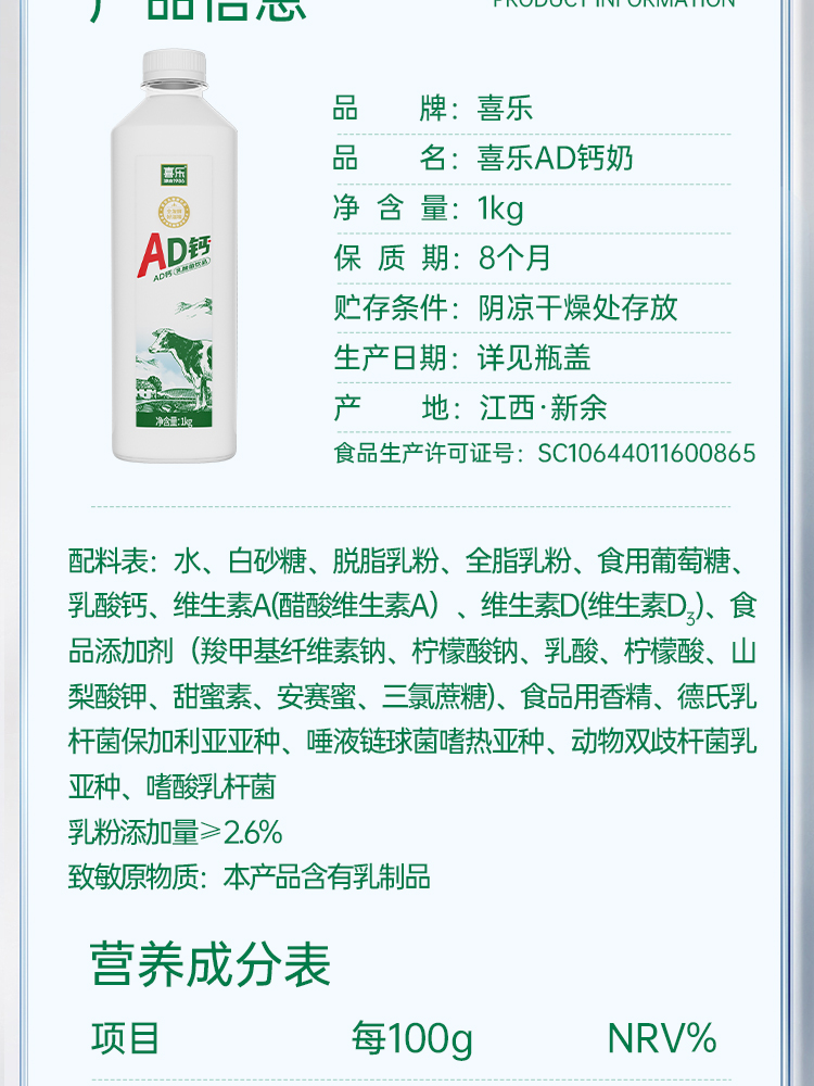 營養(yǎng)成分:添加維生素A(有促進(jìn)生長、繁殖,維持骨骼、視力等多種生理功能)、維生素D(促進(jìn)鈣、磷吸收,皮膚細(xì)胞生長分化及調(diào)節(jié)免疫功能),添加鈣
